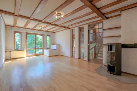 • Wohnbereich: Auf halber Treppe vom Erd- zum Obergeschoss erreichen Sie das gemütliche Wohnzimmer mit Parkettboden, Kaminofen und direktem Zugang zur Terrasse.